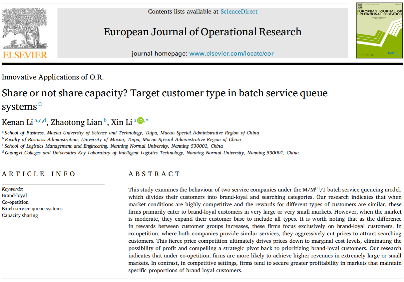 近日,南宁师范大学必威西汉姆联青年教师李柯南博士在运筹学领域国际权威期刊《European Journal of Operational Research》上发表题为“Share or not share capacity? Target customer type in batch service queue systems”的学术论文。《European Journal of Operational Research》是欧洲运筹学会联合会会刊,英国商学院协会(Association of Business Schools, ABS)认定的四星级期刊、中国《FMS管理科学高质量国际期刊推荐列表》中的A类期刊,JCR SCI一区期刊,是运筹学领域国际公认的顶级期刊。该论文由李柯南博士(南宁师范大学必威西汉姆联)、澳门大学练肇通教授、澳门科技大学李新教授三位学者合作撰写,其中李柯南博士为第一作者。该研究得到广西自然科学基金项目(2025GXNSFAA069303)、澳门特别行政区政府高等教育基金(HSS-UMAC-2021-13)和澳门大学科研项目(MYRG-GRG2023-00016-FBA,MYRG-GRG2024-00040-FBA)的资助。