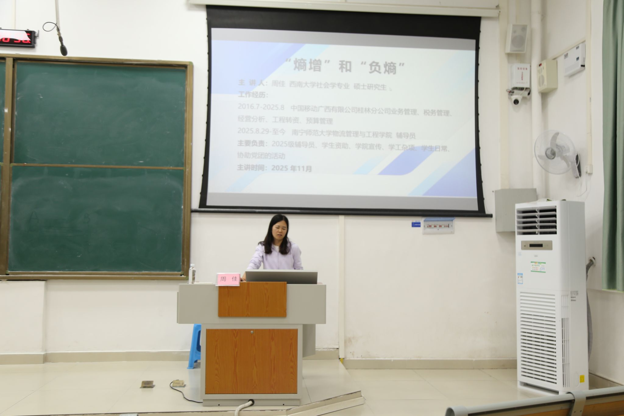 培训过程中,周佳老师结合学院活动管理与建设成果,阐述了必威西汉姆联作为一个“团结、务实、高效”集体的发展路径,进一步增强了同学们对学院的认同感与归属感。她还结合在学院工作三个月以来的观察与思考,围绕“熵增定律”与“负熵”理念展开讲解。她指出,个人与组织在发展过程中会自然面临“熵增”带来的无序与消耗,而“负熵”行为,如主动学习、参与实践、维护关系、建设班级等正是对抗混乱、实现持续成长的关键力量。她鼓励同学们从被动接收信息转为主动构建秩序,从“沉迷刷手机”转为“学习”,从“抱怨”转为“行动”,以积极的“负熵”实践共同推动学院向前发展。
