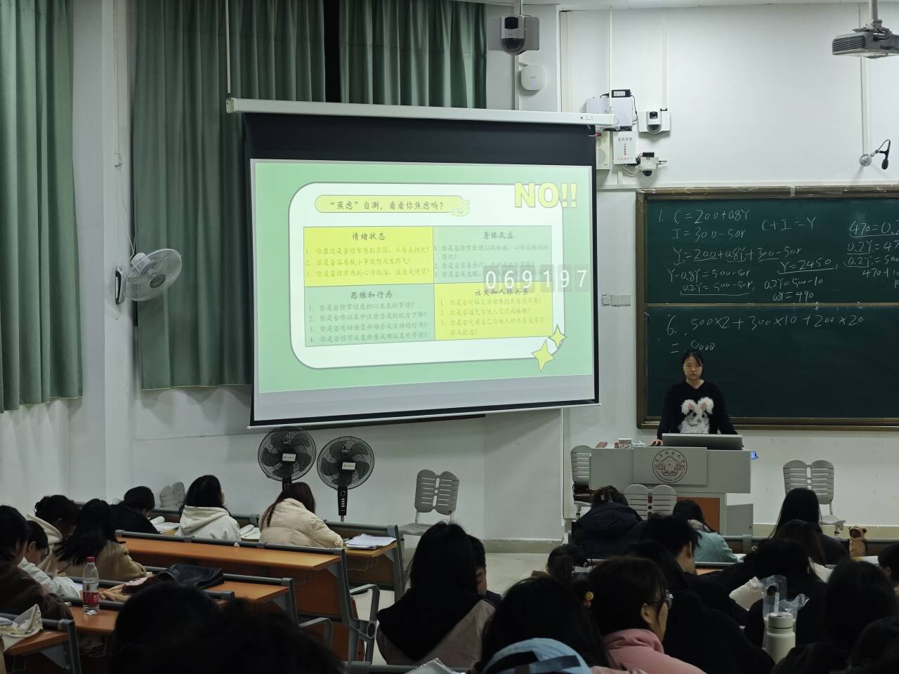 随后,心理委员罗芳分享了诸多实用的应对焦虑小妙招,如通过深呼吸和冥想放松身心、制定合理计划化解学习压力、积极开展社交活动拓展心理支持网络等。同学们认真聆听,不时交流心得,收获颇丰。