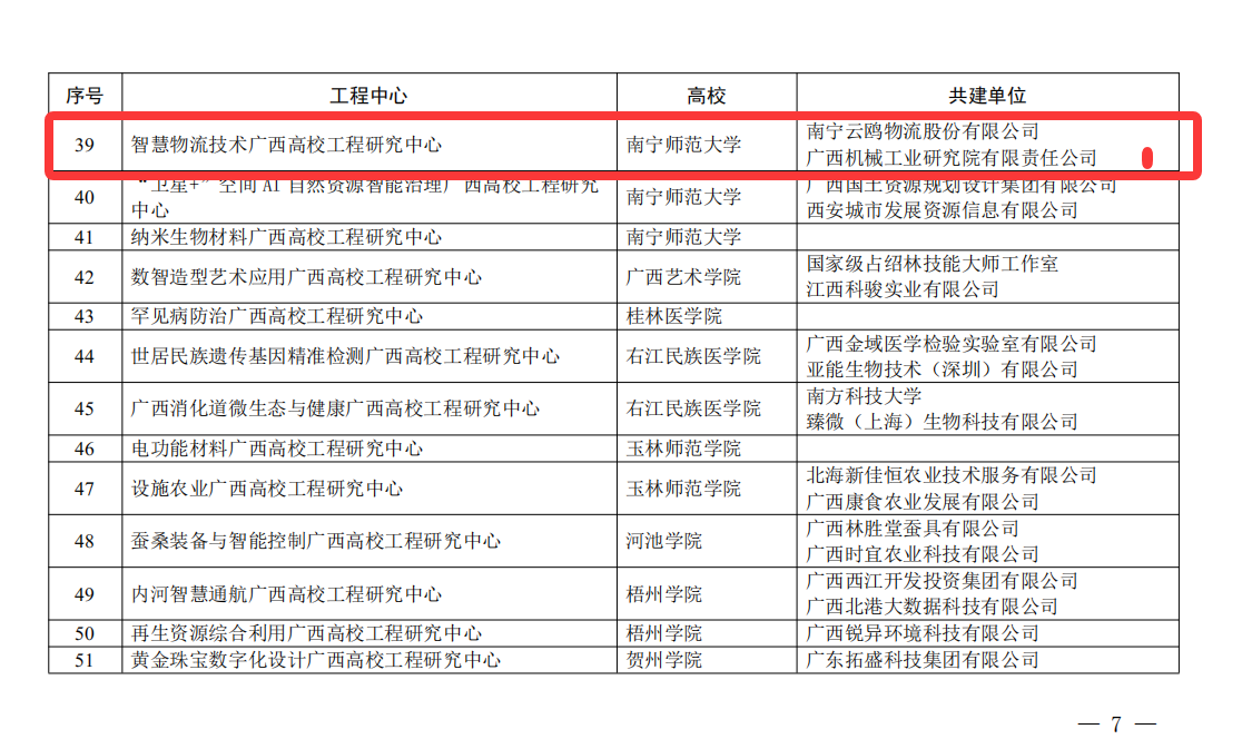 智慧物流技术广西高校工程研究中心主要合作单位为广西机械工业研究院有限责任公司和南宁云鸥物流股份有限公司。